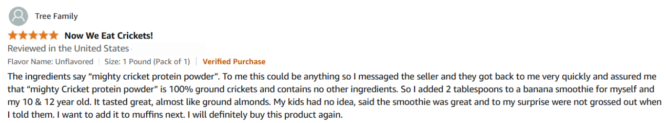 Cricket protein has a mild, nutty flavor… similar to almonds or sunflower seeds! In recipes, it blends in easily and doesn’t taste “buggy” at all.